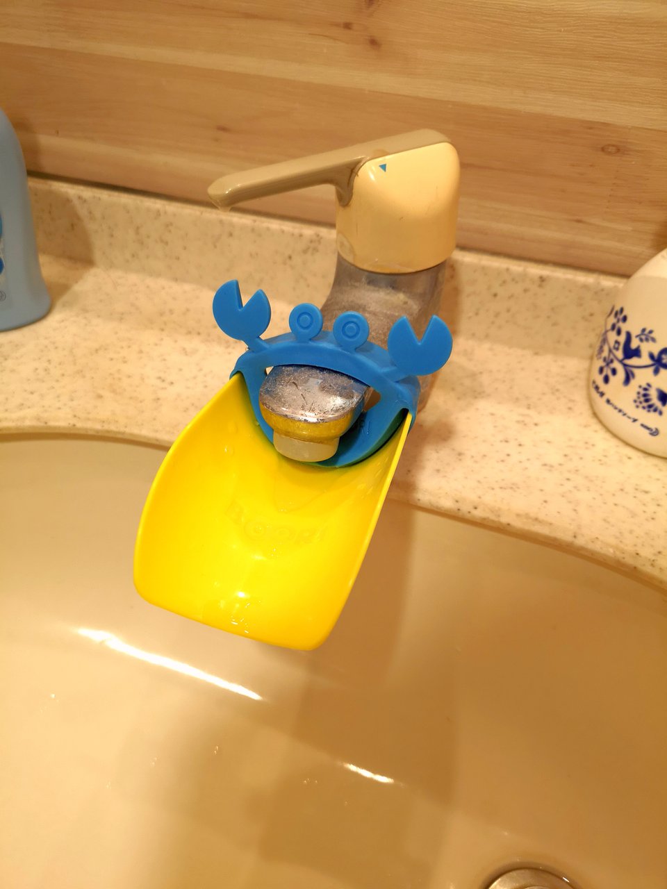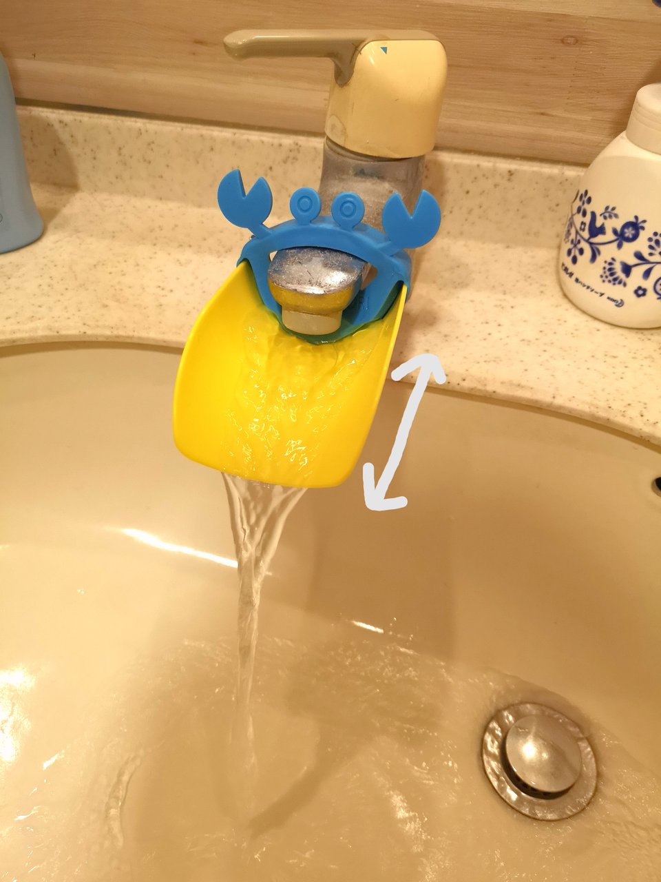 このように、ちょっと古いタイプの蛇口なので、水が垂直に落ちていき息子くんでは踏み台を使っても手が届かない状況でした。