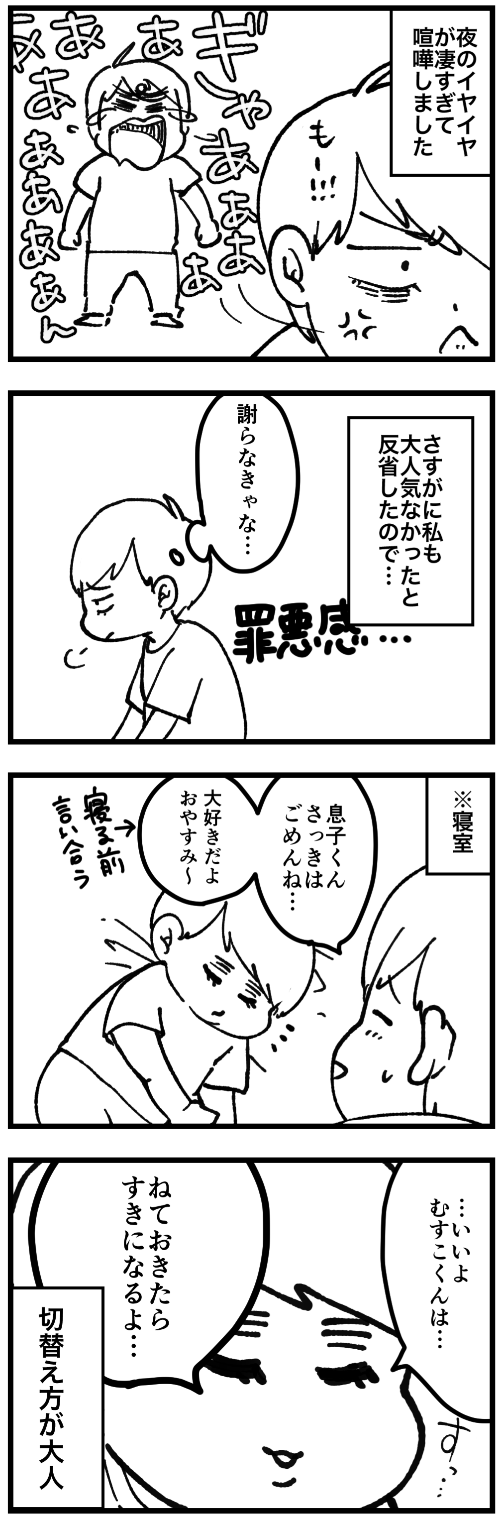 2019年07月03日 【2歳9ヶ月】そんなん言う? エッ…2歳児こんなん言うの??耳を疑ってしまった…最近喧嘩すると「おかあさんきらい!」になって、そのあと結構すぐ「おかあさんすき!」に戻ることが多いんですが…今日のは根深かったのかな…色々考えることも増えてきたんだろうな〜と夫にこのマンガ見せて二人で勝手に感動しました。(本人は寝てるのに)いや、よく考えたら今回のこれ私は別に悪くないんだけど…wwwほんとにイヤイヤがすごかったんですよ… タグ :#子供#絵日記#男児#育児#育児絵日記#育児漫画