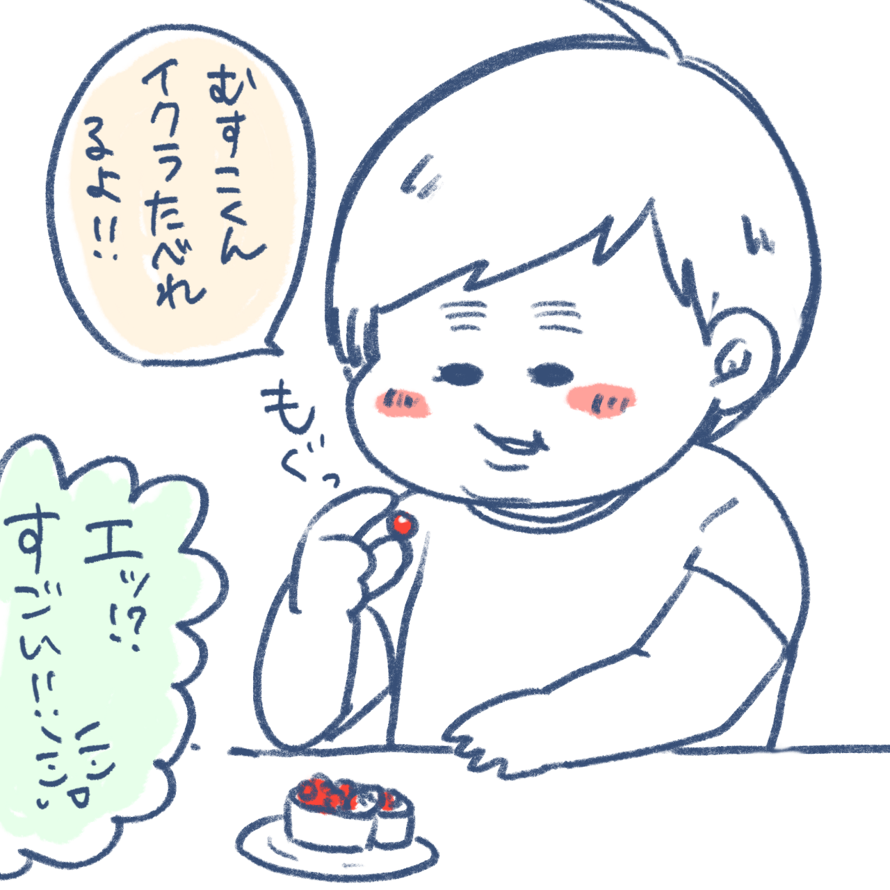 2019年05月27日 【2歳7ヶ月】謎の言い回し どこで覚えた言い方なのか…!?突然いくらデビューすると言い出した息子くん、いくらを2粒だけ食べました。私が「お魚の味するでしょ?」と言ったら、夫に向かって「おとうさん!これおさかなのあじするんだよ!」と何故かドヤ顔でした…結局フライドポテト食べて終わった感。更新サボりまくってましたが元気です。暑くなってきましたね…(ヽ´ω`) タグ :#男児#育児漫画#育児絵日記#育児#育児絵
